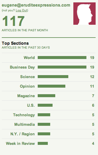 So, today is day 1 of the unveiling of the paywall, and I’m pretty sure I’ll hit my 20-article quote in the next few days. Take a look at the number of article’s I’ve read last month, broken down by section: