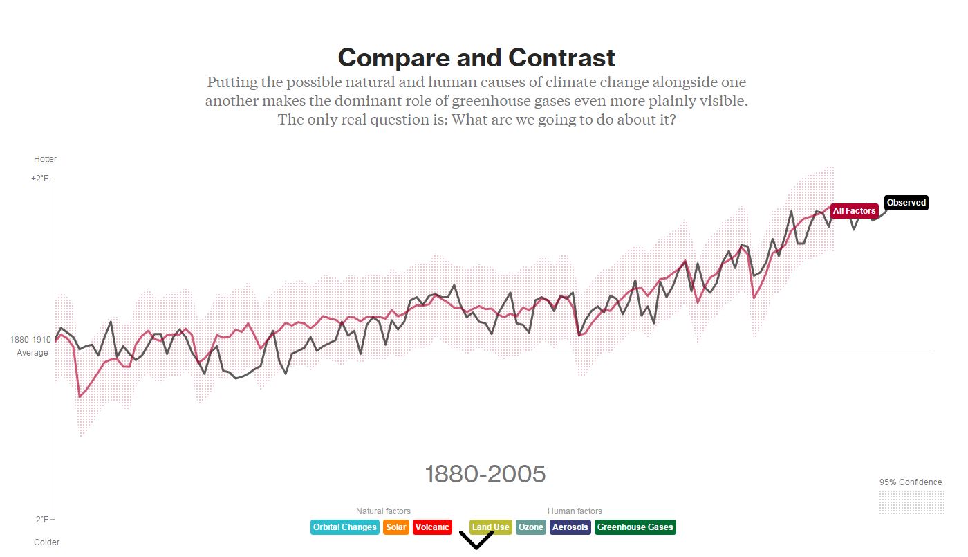 Bloomberg has created a nice interactive to explain the cause(s) of global warming. Hint: it’s not the volcanoes or the Sun or ozone pollution. The cause of global warming is almost surely the greenhouse gas emissions.